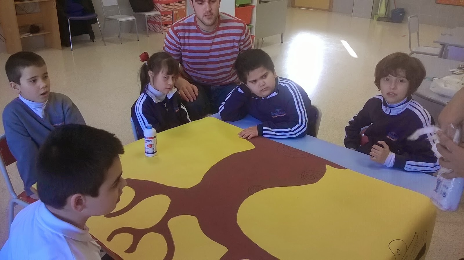 Esta semana en nuestro taller hemos hecho un árbol de invierno. Para ello, nuestros papás nos trajeron algodón para simular la nieve. El mural se nos ha quedado muy chulo, y como siempre, lo hemos colocado en nuestro pasillo.